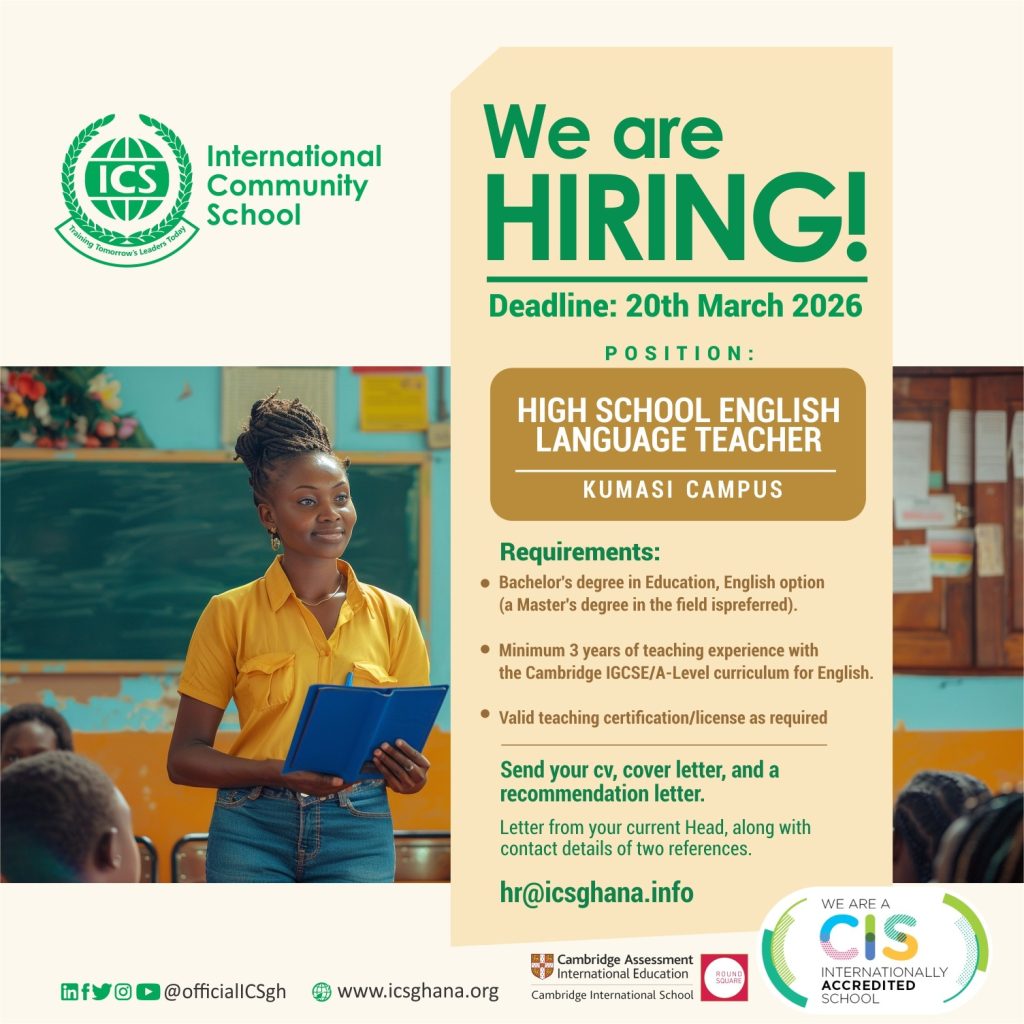 ICS Kumasi Campus invites applications for the position of High School English Language Teacher. We are looking for a qualified and experienced educator with a strong background in the Cambridge IGCSE/A-Level curriculum.