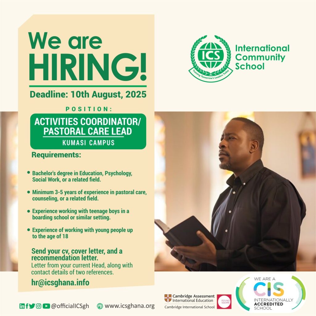 To apply, please submit your CV, cover letter, and a letter of recommendation from your current Head (along with contact details for two references) to hr@icsghana.info.