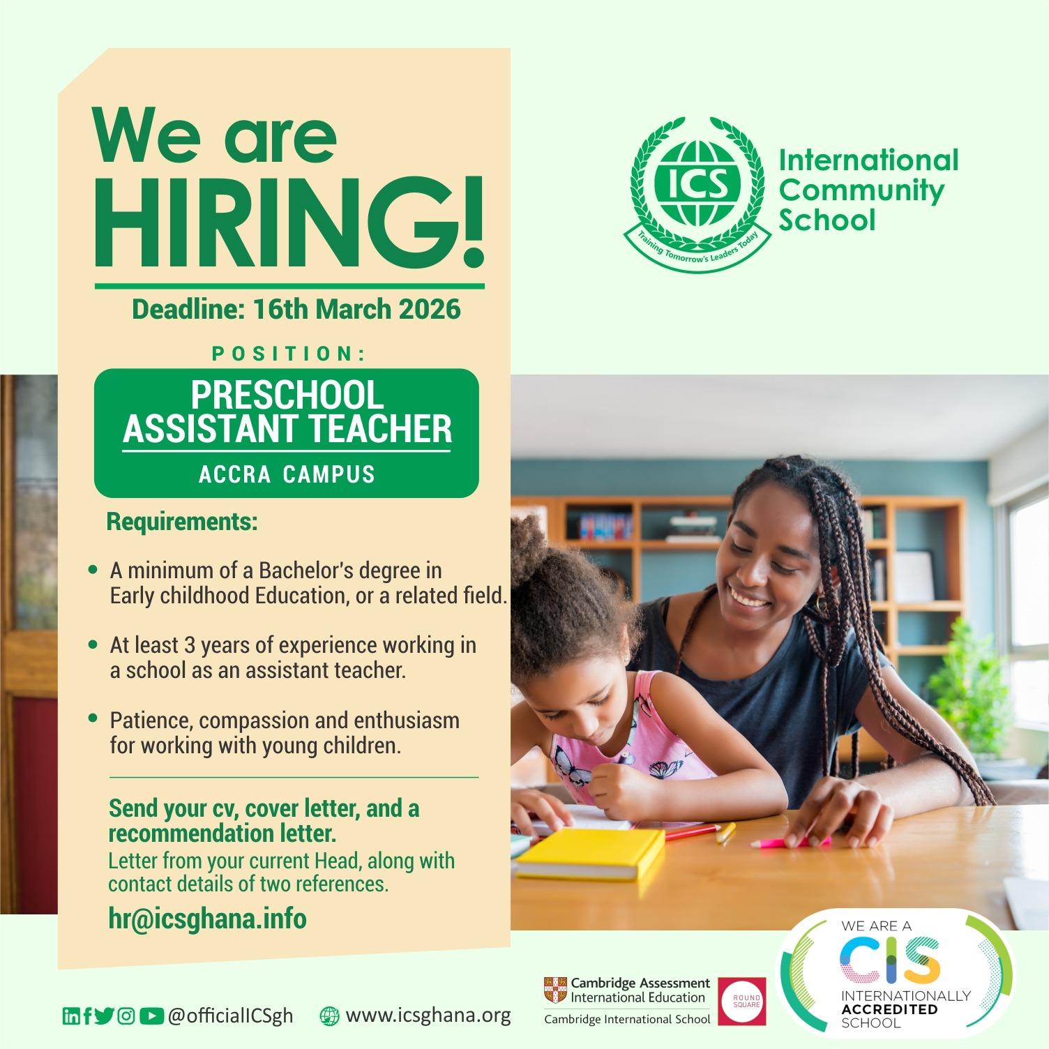 We are seeking a passionate and dedicated Preschool Assistant Teacher to join our vibrant learning community at our Accra Campus.