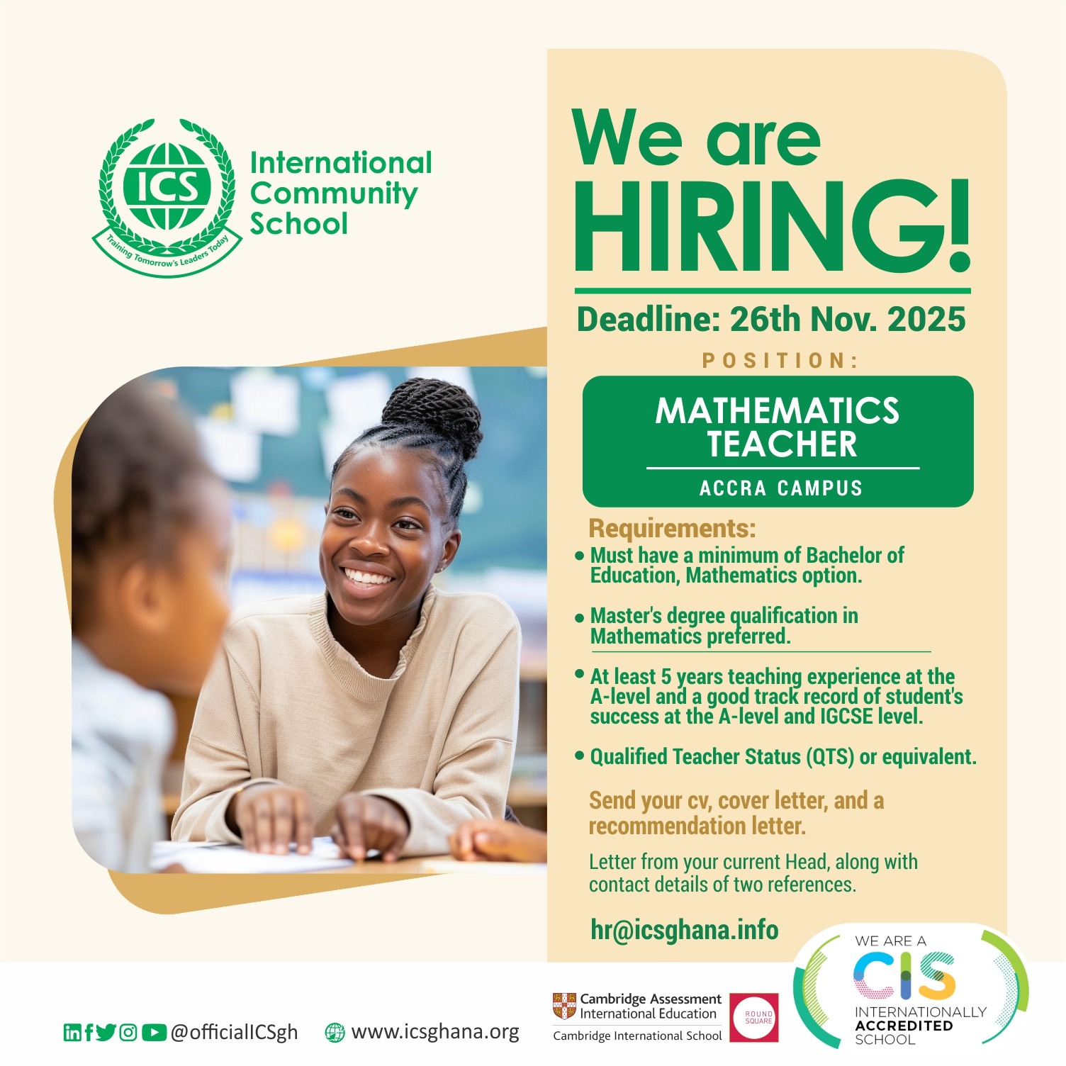 We are seeking a passionate and experienced Mathematics Teacher to join our dynamic academic team at our Accra Campus. If you are dedicated to inspiring young minds, fostering analytical thinking, and nurturing a love for mathematics, we would love to hear from you!